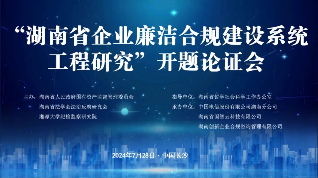 7月28日,由湘潭大学纪检监察研究院和湖南省法学会法治反腐研究会共同承担的湖南省社科基金重大委托项目“湖南企业廉洁合规建设系统工程研究开题论证会”在湖南宾馆举行。论证会以深入贯彻党的二十届三中全会精神和习近平总书记考察湖南时强调“在更高起点上扎实推动中部地区崛起”等一系列重要指示精神为指导,以构建我省新质生产力和新型生产关系、助推中部崛起战略和清廉湖南建设为目标,通过对企业廉洁合规风险识别体系、管理制度、组织体系、问责和评估机制、奖惩机制、文化建设等一系列创制研究,为建设科学、完善、有效的企业廉洁合规管理体系,打造全面深化改革和全面从严治党湖南高地贡献智识力量。